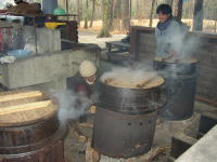 大きな釜で大豆を煮ます。ふきこぼれないように気をつけて!