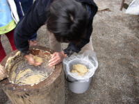 味噌たねを臼と杵をつかって押しつぶしながら空気をぬきます